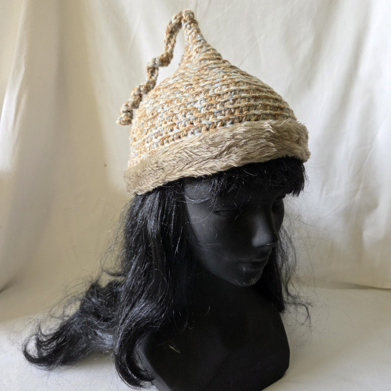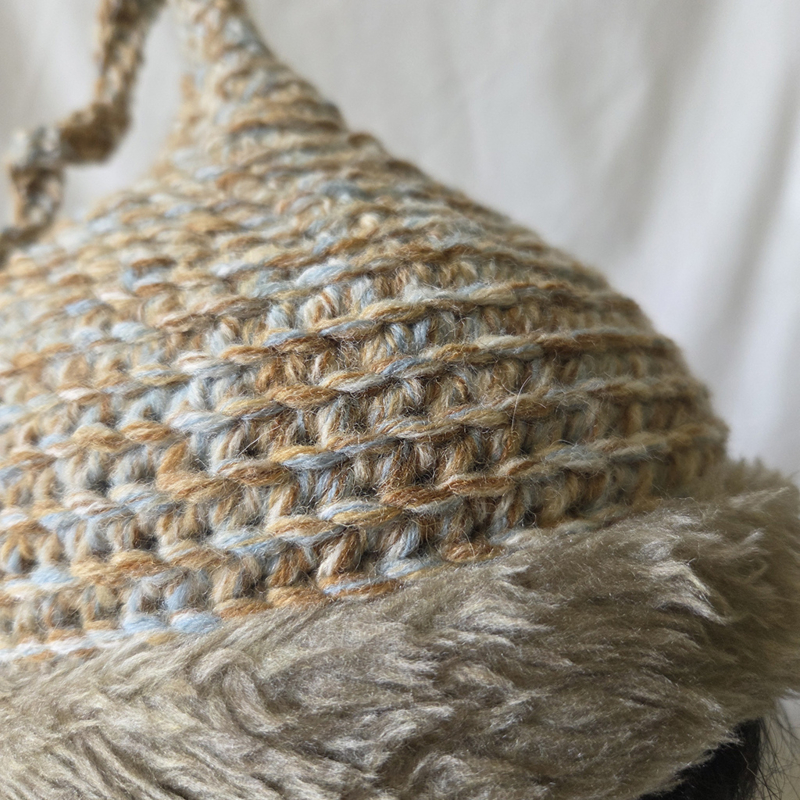 Beige gemeleerd gehaakte punt muts met nepbontje