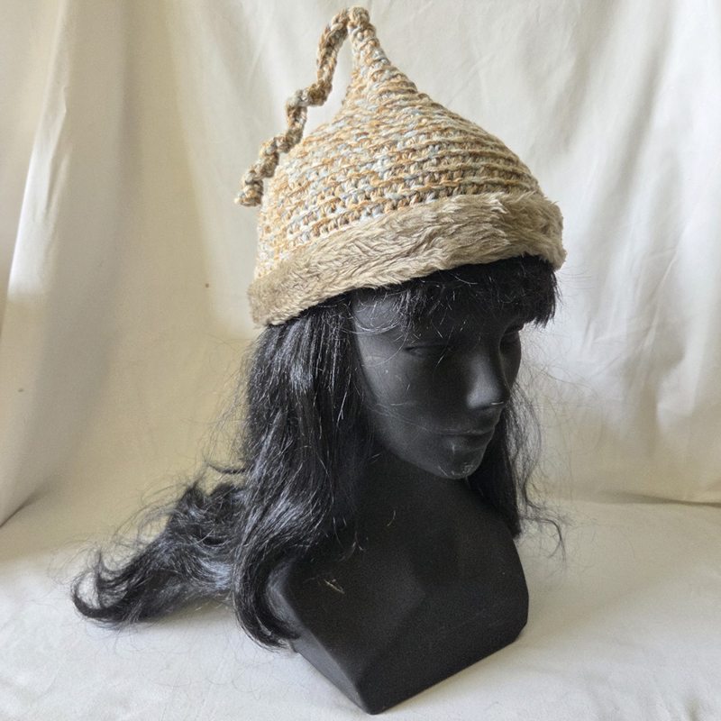 Beige gemeleerd gehaakte punt muts met nepbontjeBeige gemeleerd gehaakte puntmuts met kort nepbontje.