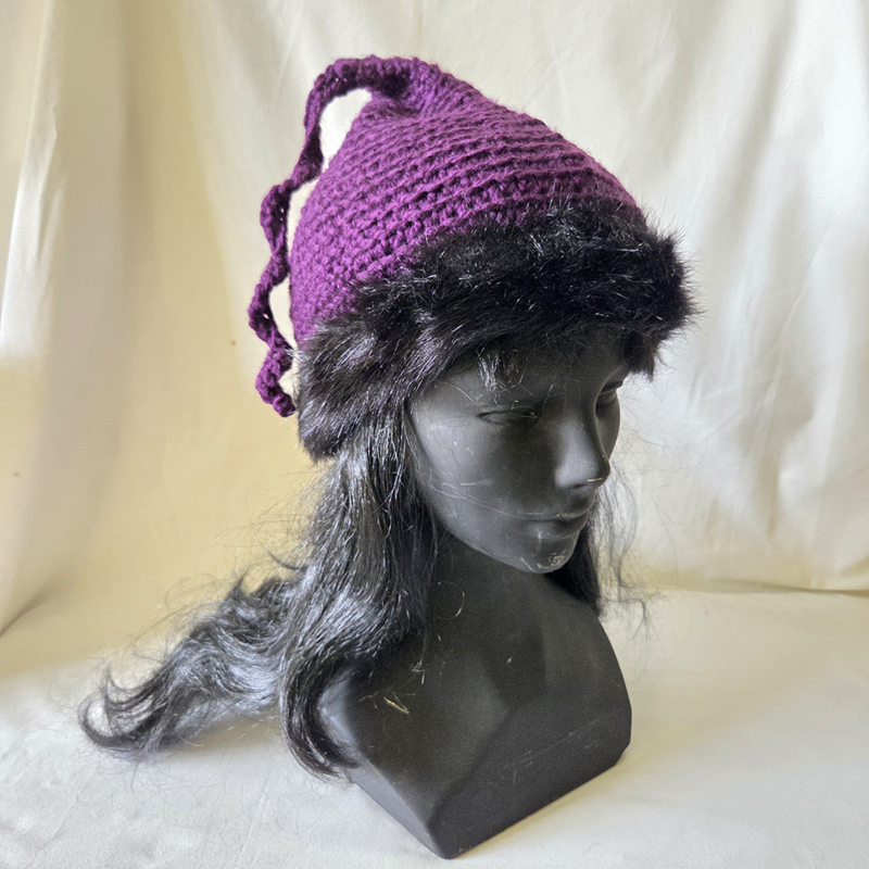 Paars gehaakte punt muts met nepbontjePaars gehaakte puntmuts met zwart nepbontje.